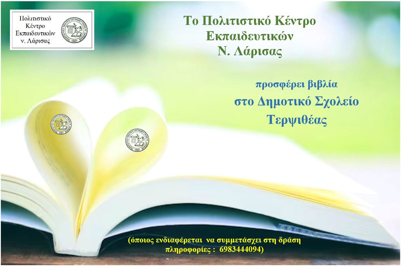 Το Πολιτιστικό Κέντρο Εκπαιδευτικών νομού Λάρισας – ΠΟΚΕΛ θα προσφέρει βιβλία στο Δημοτικό Σχολείο στην Τερψιθέα, μετά από πρόσκληση που απηύθυνε η διευθύντρια Πιτσίλκα Ελένη και ο Σύλλογος Διδασκόντων κι ανέλαβε την πρωτοβουλία η εκπαιδευτικός Γκίνη Χρυσοβαλάντω, προκειμένου να ενισχυθεί η βιβλιοθήκη του σχολείου.