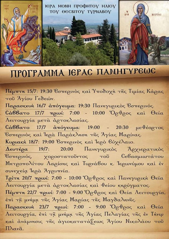 Το πρόγραμμα εορτασμού της Ιεράς Μονής Προφήτου Ηλιού Τυρνάβου