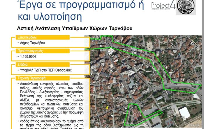 Εγκρίθηκε από το δημοτικό συμβούλιο του δήμου Τυρνάβου η μελέτη για το Σχέδιο Βιώσιμης Αστικής Κινητικότητας του Τυρνάβου που συνέταξε ο ανάδοχος και η οποία περιλαμβάνει αποτύπωση της υπάρχουσας κατάστασης αναφορικά με το οδικό δίκτυο, το δίκτυο πεζοδρόμων, τους χώρους στάθμευσης τα προβλήματα σε κεντρικές οδούς, τη συμπεριφορά οδηγών και πεζών αλλά και σενάρια για την βελτίωση της κινητικότητας εντός της πόλης με τη δημιουργία χώρων στάθμευσης, δικτύου πεζοδρόμων και πεζοδρομίων, οδούς ήπιας κυκλοφορίας, παρακάμψεις κ.λπ.
