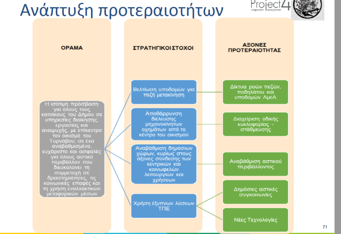 Η ισότιμη πρόσβαση για όλους τους κατοίκους του Δήμου σε υπηρεσίες διοίκησης, εργασίας και αναψυχής, με επίκεντρο τον οικισμό του Τυρνάβου, σε ένα αναβαθμισμένο, ευχάριστο και ασφαλές για όλους αστικό περιβάλλον που διευκολύνει τη συμμετοχή σε δραστηριότητες, τις κοινωνικές επαφές και τη χρήση εναλλακτικών μεταφορικών μέσων.