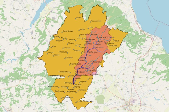Εικόνα 2. Ο «Δήμος Ελασσόνας» (με «πορτοκαλί» απόχρωση), οι οικισμοί του, (σύμφωνα με τα στοιχεία της απογραφής του 2011), η υδρολογική λεκάνη (με «βυσσινί» απόχρωση) και το υδρογραφικό δίκτυο με «γαλάζια/μπλε» απόχρωση, (με διαβάθμιση της παλέττας των χρωμάτων από πιο ανοιχτόχρωμα προς πιο σκουρόχρωμα και του πάχους των γραμμών από λεπτότερες προς παχύτερες, μεταβαίνοντας από τα πηγαία ρέματα προς την εκβολή του), του «Ποταμού Ελασσονίτη» με την χρήση «Γ.Π.Σ.».