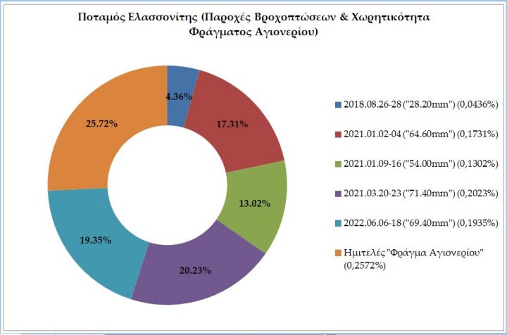 Αξίζει να σημειωθεί το γεγονός ότι όσον αφορά τον ημιτελή «ταμιευτήρα αποθήκευσης νερού», (ημιτελές «Φράγμα Αγιονερίου», ύψους στέψης 48 μέτρων και μήκους στέψης 195 μέτρων, με περιβαλλοντική παροχή νερού ίση με 735,00 κυβικά μέτρα ανά ώρα), σχεδιάστηκε έτσι ώστε να αποθηκεύει όγκο νερού ίσο με «15,40 κυβικά εκτόμετρα» («15,40 hm3») ή αλλιώς «15,40Χ106 κυβικά μέτρα» ή («15,40Χ106 m3») ή («15.400.000 κυβικά μέτρα») ή («15.400.000 m3»). Κατά συνέπεια, τα πέντε παραπάνω αναφερθέντα, διαφορετικά επεισόδια βροχόπτωσης θα γέμιζαν το «Φράγμα Αγιονερίου» περίπου τρεις φορές, («2,89 φορές για την ακρίβεια»). Με άλλα λόγια, η συνολική χωρητικότητα του ημιτελούς ταμιευτήρα αποθήκευσης νερού του «Φράγματος Αγιονερίου» αποτελεί το 34,63% της, αποκλειστικά αυτούσιας, συνολικής ποσότητας νερού που «κατέβασε» ο «Ποταμός Ελασσονίτης», μόνο κατά την διάρκεια πέντε διαφορετικών επεισοδίων βροχοπτώσεων, (συνολικού ύψους βροχής 287,60mm), όπως φαίνεται στην παρακάτω εικόνα.