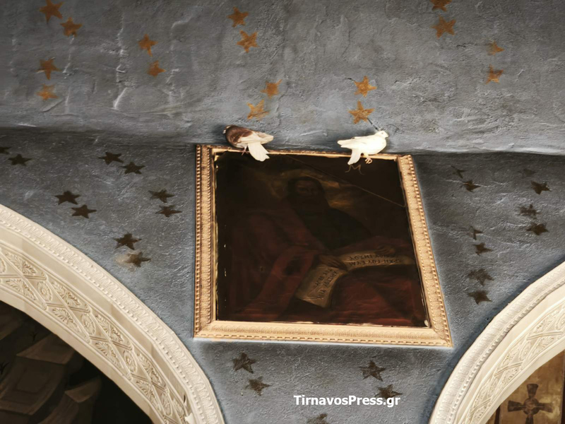 Τρία λευκά περιστέρια, τα οποία αφέθηκαν ελεύθερα σε συμβολική αναπαράσταση του Αγίου Πνεύματος, επέλεξαν να καθίσουν σε μια εικόνα του Ευαγγελιστή Λουκά, που βρίσκεται ψηλά στον ναό, δεξιά και αριστερά της κορνίζας.
