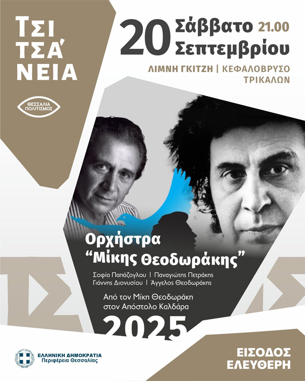 Σε αυτή τη μοναδική συναυλία με τίτλο «Από το Μίκη Θεοδωράκη στον Απόστολο Καλδάρα» που διοργανώνει η Περιφέρεια Θεσσαλίας και η Π.Ε. Τρικάλων, στο πλαίσιο των Τσιτσανείων, αλλά και του εορτασμού «100 χρόνια από τη γέννηση του Μίκη Θεοδωράκη», το Σάββατο 20 Σεπτεμβρίου στο Δημοτικό Γήπεδο Κεφαλόβρυσου, συναντιούνται δύο ξεχωριστοί όσο και διαφορετικοί μουσικοί κόσμοι. Εκείνος του πρωτομάστορα του λαϊκού τραγουδιού, του Τρικαλινού  Απόστολου Καλδάρα (1922-1990) με εκείνον του παγκοσμίως αναγνωρισμένου Μίκη Θεοδωράκη (1925 – 2021 ). Και οι δυο υπηρέτησαν με αξιοσύνη τη λαϊκή μουσική του τόπου, ο καθένας με το δικό του τρόπο, με τα δικά του μουσικά εφόδια. Ωστόσο η λαϊκή μουσική τους σκέψη κάπου συναντιέται. Ο Μίκης Θεοδωράκης ανέπτυξε πολύπλευρη μουσική δράση, η οποία καλύπτει όλο σχεδόν το φάσμα της τέχνης των ήχων. Η λαϊκή μουσική όμως ήταν αυτή που του έδωσε τη δυνατότητα της άμεσης επικοινωνίας με όλο τον Ελληνισμό. Δεν μοιάζει, λοιπόν, αταίριαστη η συνύπαρξη των τραγουδιών των δυο μεγάλων μουσικών δημιουργών, όπως αυτή που επιχειρείται σε αυτό το πρωτότυπο πρόγραμμα. Αντίθετα, συνυφασμένα τα τραγούδια του μεγάλου Τρικαλινού Απόστολου Καλδάρα και του Μίκη Θεοδωράκη δημιουργούν ένα σαγηνευτικό μουσικό πλέγμα, ένα ιδιαίτερο πρόγραμμα ακρόασης, ικανό να προκαλέσει ευφορία και συγκίνηση μαζί. Τα Τσιτσάνεια τιμούν με αυτή η χειρονομία στο πρόσωπο του Απόστολου Καλδάρα τη μεγάλη μουσική Σχολή των Τρικάλων.  Θα παρευρεθούν και θα μιλήσουν η Μαργαρίτα Θεοδωράκη, κόρη του Μίκη Θεοδωράκη  και ο Κώστας Καλδάρας, γιος του Απόστολου Καλδάρα.