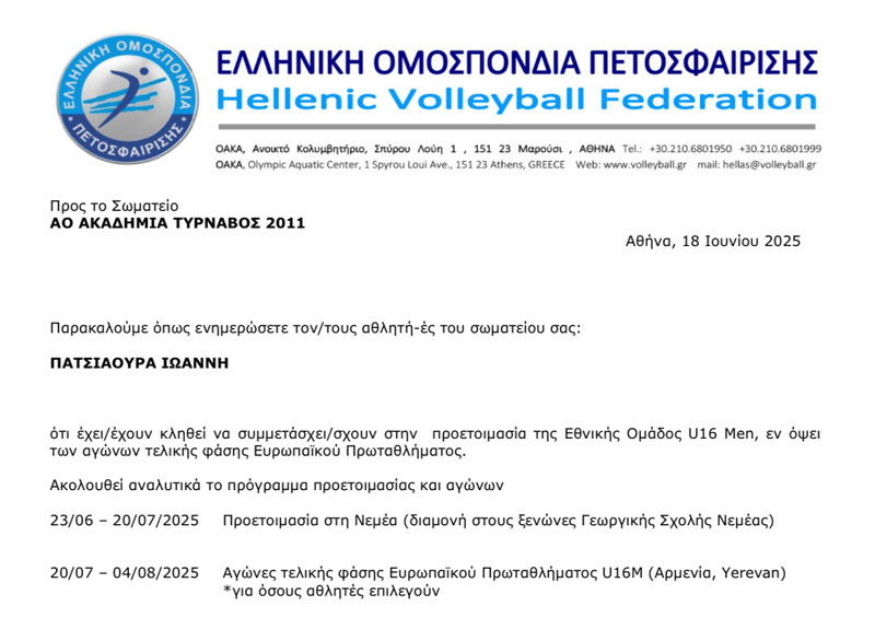 Μια ακόμη σημαντική διάκριση για τον αθλητή Ιωάννη Πατσιαούρα της ΑΟ Ακαδημία Τύρναβος, ο οποίος κλήθηκε για τρίτη φορά στην Εθνική Ομάδα U16 Ανδρών, επιβεβαιώνοντας τη σταθερά ανοδική πορεία του στον χώρο της πετοσφαίρισης.