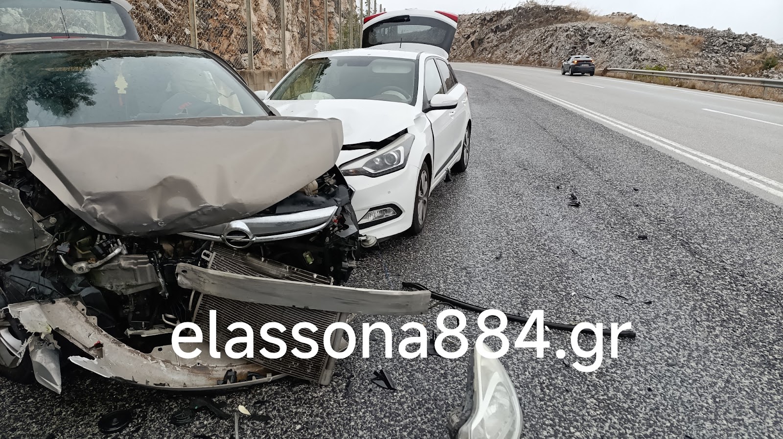 με αποτέλεσμα, πρώτα να πέσει πάνω στα κιγκλιδώματα του δρόμου και στη συνέχεια να πεταχτεί στο αντίθετο ρεύμα κυκλοφορίας στο τοιχείο αντίστιξης, με αποτέλεσμα επερχόμενο αυτοκίνητο με κατεύθυνση προς Τύρναβο να πέσει πάνω του.