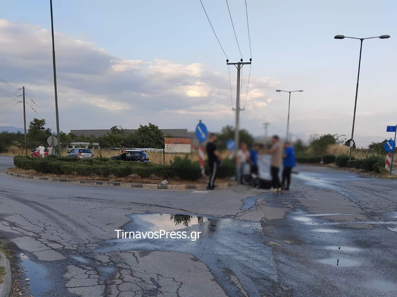 Τροχαίο ατύχημα σημειώθηκε το απόγευμα του Σαββάτου (23 Αυγούστου 2025) στον κόμβο Ειρήνης στον Τύρναβο, όταν Ι.Χ. αυτοκίνητο συγκρούστηκε με μηχανάκι.