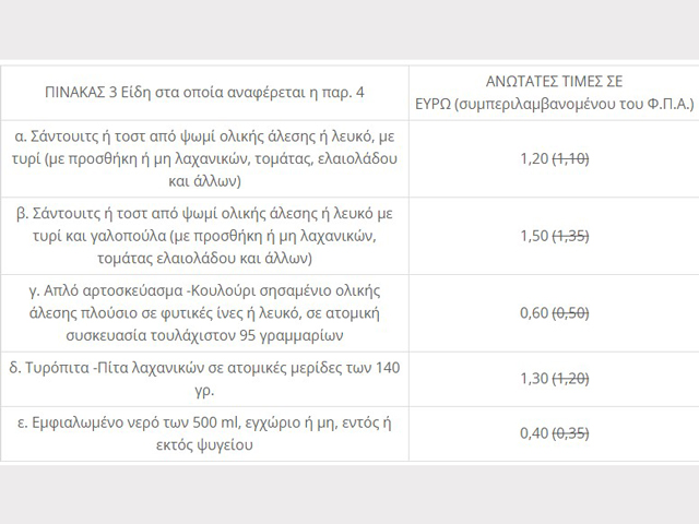 «Κανόνες υγιεινής σχολικών κυλικείων, καντινών (σταθερών), χώρων εστίασης εντός των σχολείων και καθορισμός των προϊόντων που διατίθενται από αυτά εντός δημοσίων και ιδιωτικών σχολείων πρωτοβάθμιας και δευτεροβάθμιας εκπαίδευσης» (Β’ 2135) υγειονομικής διάταξης, τα είδη που αναφέρονται στον Πίνακα 3, διατίθενται σε ανώτατες προκαθορισμένες τιμές ως ακολούθως: