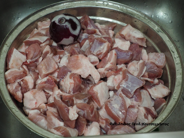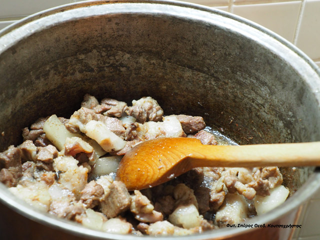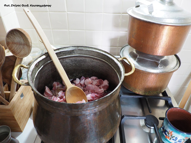 *Σε μια κατσαρόλα, ( παλαιότερα χάλκινη επικασσιτερωμένη – γανωμένη) βάζουμε μέχρι την μέση, χοιρινό λαιμό με λίπος ή χοιρινή πανσέτα χωρίς κόκαλο κομμένα σε κύβους, όπως τα λουκούμια .