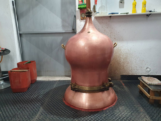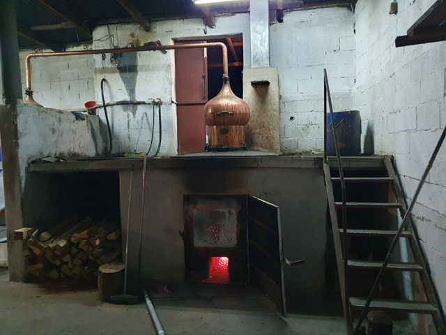 Το φυσικό αέριο και το προπάνιο έχουν αντικαταστήσει τα καυσόξυλα και με εξελιγμένους καυστήρες η θερμοκρασία βρασμού διατηρείται σταθερή στο χάλκινο καζάνι κάτι που ανεβάζει την ποιότητα του παραγόμενου προϊόντος. Αφού γεμίσει το καζάνι με κρασί και υπολείμματα σταφυλιού χωρίς πλέον τα κοτσάνια, η καμπάνα σφραγίζεται και αρχίζει ο βρασμός και η απόσταξη.