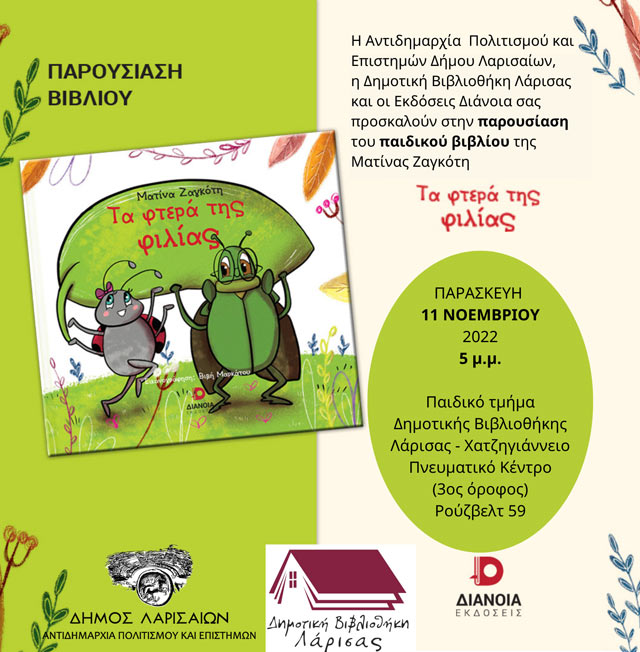 Η Αντιδημαρχία Πολιτισμού και Επιστημών Δήμου Λαρισαίων, η Δημοτική Βιβλιοθήκη Λάρισας και οι Εκδόσεις Διάνοια διοργανώνουν την Παρασκευή 11 Νοεμβρίου 2022 και ώρα 17.00, στο παιδικό τμήμα της Βιβλιοθήκης (Χατζηγιάννειο Πνευματικό Κέντρο, 3ος όροφος), την παρουσίαση του παιδικού βιβλίου της Ματίνας Ζαγκότη “Τα φτερά της φιλίας”, σε εικονογράφηση Βιβής Μαρκάτου.