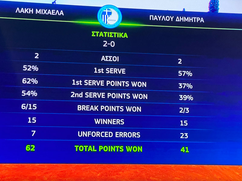 Μετά από έναν καταπλυκτικό τελικό στον Ο.Α. Αθηνών, η Μιχαέλα Λάκη επικράτησε της καλής της φίλης και συμπαίκτριας στις Εθνικές ομάδες juniors και γυναικών, Δήμητρας Παύλου, με 6-3, 6-0, για να γίνει η νέα πρωταθλήτρια Ελλάδας στην κατηγορία των γυναικών.