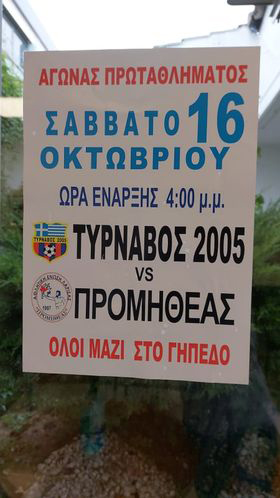 Το Σάββατο 16 Οκτωβρίου στις 4 μ.μ. η ποδοσφαιρική ομάδα του Τυρνάβου, Τύρναβος 2005 θα αντιμετωπίσει τον Προμηθέα Λάρισας, σε μία αναμέτρηση στο Δημοτικό Γήπεδο Τυρνάβου.