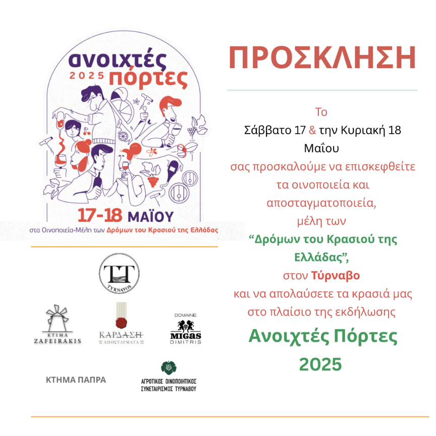 Τα οινοποιεία του Τυρνάβου ανοίγουν τις πόρτες τους στο κοινό το Σάββατο 17 και την Κυριακή 18 Μαΐου, συμμετέχοντας στη μεγάλη γιορτή του ελληνικού κρασιού, “Ανοιχτές Πόρτες”, που διοργανώνεται πανελλαδικά από τα μέλη των Δρόμων του Κρασιού της Ελλάδας.