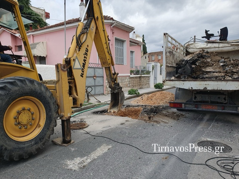 Σε εξέλιξη βρίσκονται τα έργα της ΔΕΥΑΤ στον Τύρναβο, στη Λεωφόρο Ηρώων Πολυτεχνείου μπροστά από το κτίριο του ΟΤΕ, εξαιτίας διαρροής από τροφοδοτικό αγωγό ύδρευσης.