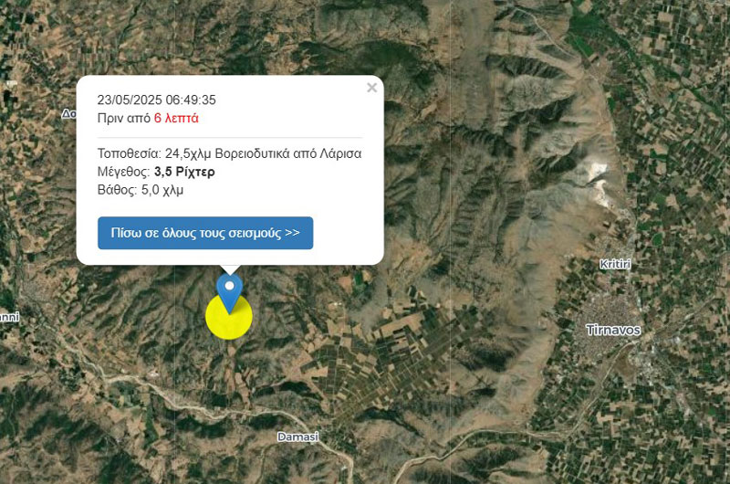Σεισμός μεγέθους 3,5 βαθμών της κλίμακας Ρίχτερ σημειώθηκε το πρωί της Παρασκευής 23 Μαΐου 2025, στις 06:49, 26,2 χιλιόμετρα βορειοδυτικά της Λάρισας.