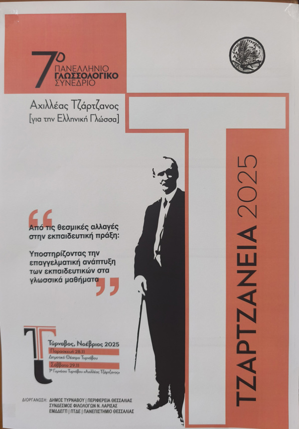 «Ο Δήμος Τυρνάβου στις 28 και 29 Νοεμβρίου φιλοξενεί το 7ο Πανελλήνιο Γλωσσολογικό Συνέδριο “Τζαρτζάνεια”. Στη γενέτειρα του Αχιλλέα Τζάρτζανου, αυτού του τόσο σημαντικού γλωσσολόγου και πνευματικού ανθρώπου, θεωρούμε ότι είναι χρέος μας η συνέχιση αυτού του συνεδρίου, που αποτελεί σημείο αναφοράς για τη Γλωσσική Επιστήμη.