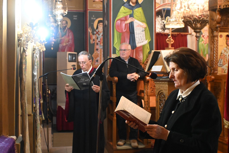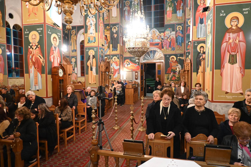 Κατά τη διάρκεια της Ακολουθίας, οι πιστοί έψαλαν με ευλάβεια τους Χαιρετισμούς, ενώ ο ναός πλημμύρισε από το φως των κεριών και τη μυσταγωγική ατμόσφαιρα που δημιουργούσε η υμνολογία της Εκκλησίας.