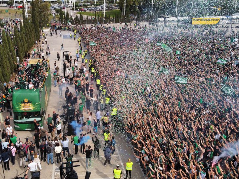 Εκεί οι συγκεντρωμένοι οπαδοί αποθέωσαν τους «πράσινους» με συνθήματα και καπνογόνα, με τον Κώστα Σλούκα, τον Εργκίν Αταμάν και τον Δημήτρη Γιαννακόπουλο να έχουν την τιμητική τους.