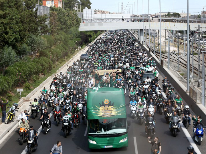 Είναι χαρακτηριστικό, μάλιστα, πως η πομπή αυτή δημιουργήσε μεγάλα προβλήματα στην κίνηση, με αποτέλεσμα να κλείσει εκτάκτως το ρεύμα της Αττικής Οδού προς την Ελευσίνα «λόγω αυτοκινητοπομπής και φιλάθλων». Αυτό καθόλου δεν χάλασε, πάντως, τους παίκτες των «πρασίνων», με τον Ματίας Λεσόρ να διασκεδάζει με ουίσκι και ένα καπνογόνο στο χέρι, αλλά και τον Λούκα Βιλντόσα να ανεμίζει διαρκώς μία σημαία του Παναθηναϊκού!