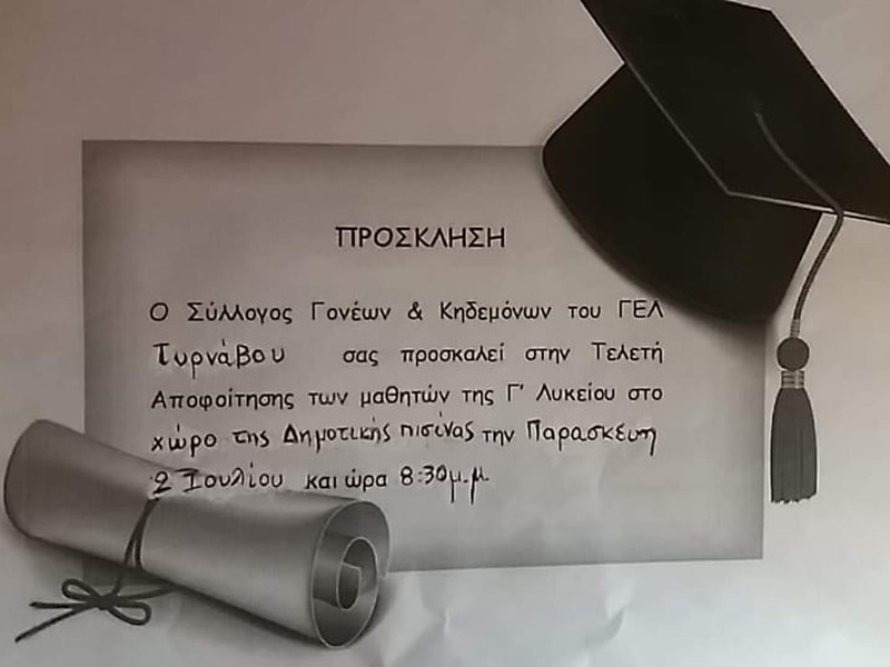 Ο Σύλλογος Γονέων και Κηδεμόνων του ΓΕΛ Τυρνάβου διοργανώνει Τελετή Αποφοίτησης των μαθητών της Γ’ Λυκείου του σχολείου την Παρασκευή 2 Ιουλίου. Η εκδήλωση θα πραγματοποιηθεί στο χώρο του Πολυδύναμου Αθλητικού κέντρου του Δήμου Τυρνάβου στις 8:30 το βράδυ.