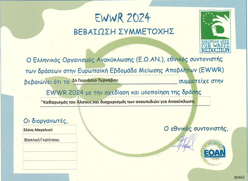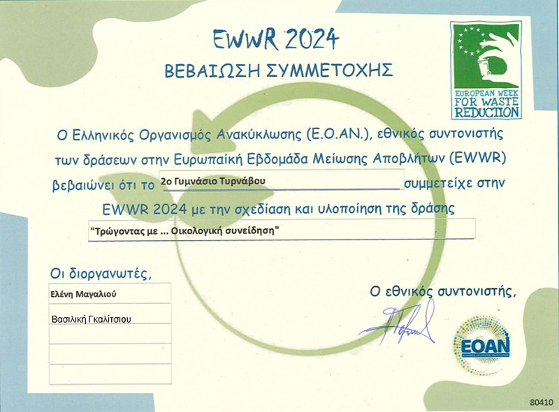 Το 2o Γυμνάσιο Τυρνάβου Λάρισας βραβεύτηκε από τον Ελληνικό Οργανισμό Ανακύκλωσης (Ε.Ο.ΑΝ.), ο οποίος είναι εθνικός συντονιστής των δράσεων στην Ευρωπαϊκή Εβδομάδα Μείωσης Αποβλήτων (EWWR), για τη συμμετοχή του με τη σχεδίαση και υλοποίηση των δράσεων: