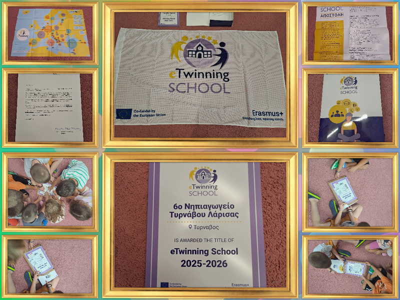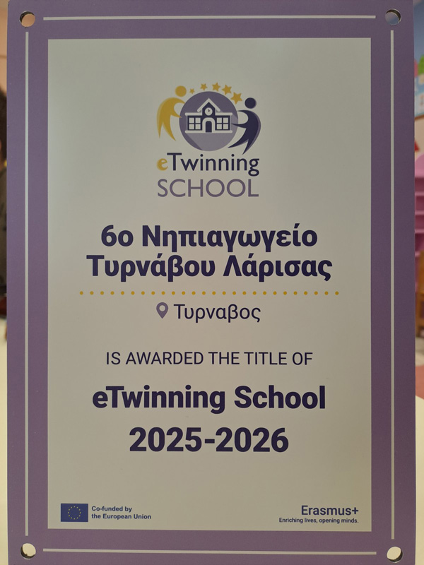 Με ιδιαίτερη χαρά και υπερηφάνεια ανακοινώνουμε ότι το 6ο Νηπιαγωγείο Τυρνάβου βραβεύτηκε από την Κεντρική Υπηρεσία Υποστήριξης eTwinning στις Βρυξέλλες με τον τίτλο eTwinning School για τα έτη 2025–2026.