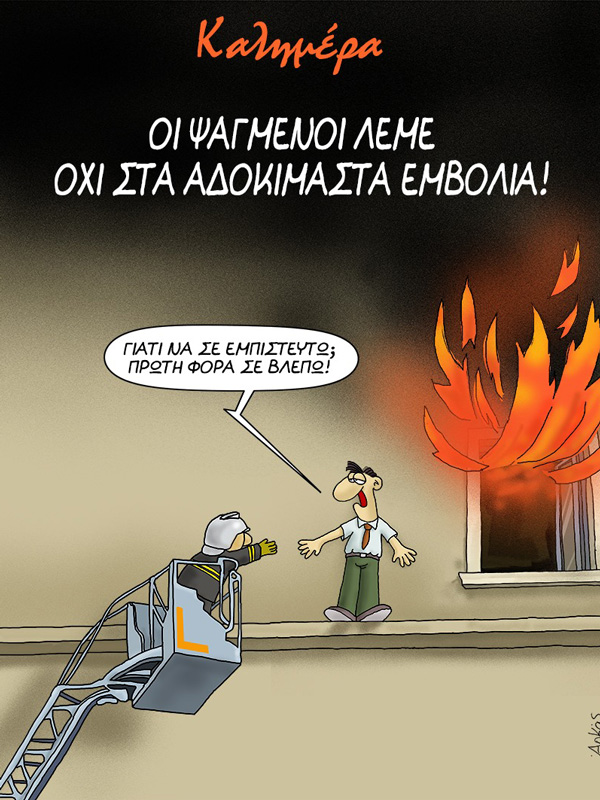 Σε σκίτσο που ανέβασε στην επίσημη σελίδα του στο facebook, δημοσίευσε καρέ όπου απεικονίζεται ένας άνθρωπος σε περβάζι ο οποίος αρνείται τη βοήθεια πυροσβέστη έναντι της φωτιάς που καίει το σπίτι του.