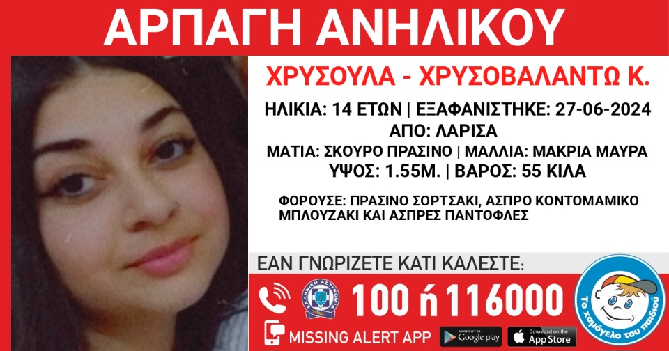 Αίσιο τέλος στην περιπέτεια της Χρυσούλας – Χρυσοβαλάντως Κ. 14 ετών που είχε εξαφανιστεί από τη Λάρισα. Η ανήλικη βρέθηκε και είναι καλά στην υγεία της, όπως ανακοίνωσε το «Χαμόγελο του Παιδιού».