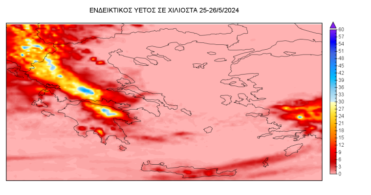 Ασθενή διαταραχή θα επηρεάσει τμήματα της ηπειρωτικής χώρας και του Ιονίου σήμερα από αργά το απόγευμα αλλά και αύριο έως τις απογευματινές ώρες 25-26/5/2024.