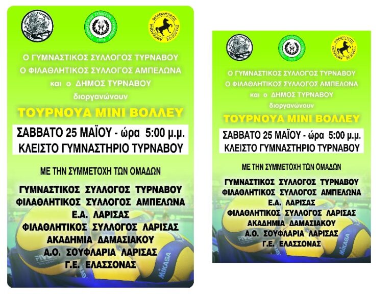 Το Δ.Σ. του Γ.Σ.ΤΥΡΝΑΒΟΥ σας γνωρίζει ότι ξεκίνησαν οι εγγραφές για αγόρια από 5-12 ετών στην Ακαδημία ΜΠΑΣΚΕΤ του συλλόγου μας. Καθημερινά από 5.00-8.00 το απόγευμα στα γραφεία του συλλόγου μας στο κλειστό γυμναστήριο Τυρνάβου.