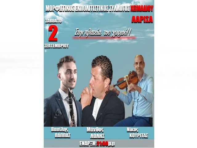 Ο Μορφωτικός Εκπολιτιστικός Σύλλογος Χειμαδίου σας προσκαλεί στην ετήσια χοροεσπερίδα που διοργανώνει το Σάββατο 2 Σεπτεμβρίου 2023 στην πλατεία του χωριού.