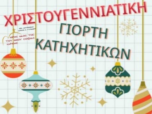 Με πολλή χαρά η Ιερά Μητρόπολη Λαρίσης και Τυρνάβου προσκαλεί όλους μας, μικρούς και μεγάλους, στη Χριστουγεννιάτικη εορτή των Κατηχητικών Σχολείων, που θα πραγματοποιηθεί την Κυριακή 17 Δεκεμβρίου 2023, στις 6.00 μ.μ. στον Ιερό Ναό της του Θεού Σοφίας Λαρίσης.