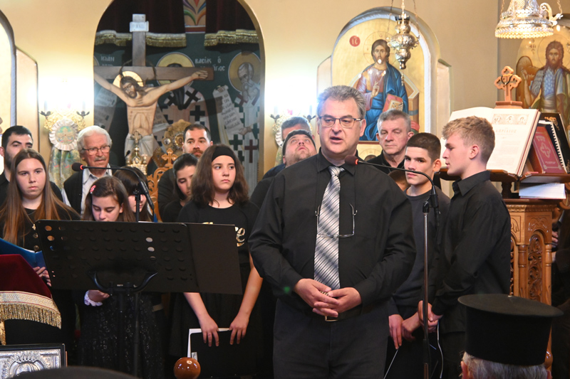 Ο Καθηγητής της Σχολής Πρωτοψάλτης Χριστόφορος Καρυώτης φανερά συγκινημένος καθοδήγησε τα παιδιά του μίλησε με θερμά λόγια για την ιστορική παράδοση του Τυρνάβου και ζήτησε άλλη μια φορά από τους γονείς να στείλουν τα παιδιά τους να γίνουν κοινωνοί της Βυζαντινής Μουσικής.