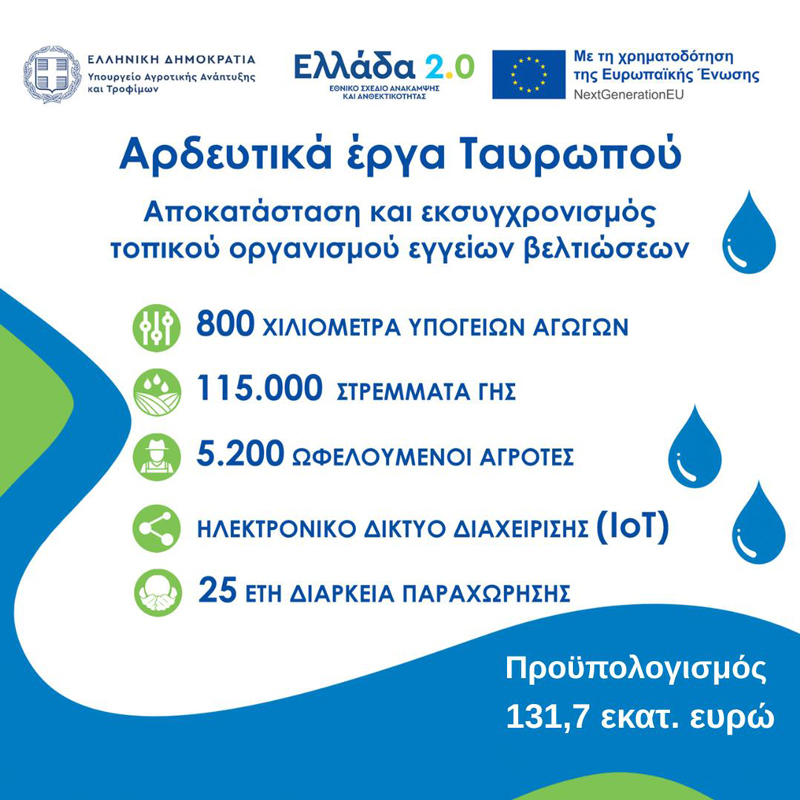 «Τα έργα Ταυρωπού και Υπέρειας–Ορφανών είναι τα πρώτα αρδευτικά έργα που υλοποιούνται ως ΣΔΙΤ στη χώρα, με αξιοποίηση και πόρων του Ταμείου Ανάκαμψης. Οι συμβάσεις τους εξασφαλίζουν όχι μόνο την κατασκευή, αλλά και τη λειτουργία ενός σύγχρονου, πλήρως υπόγειου αρδευτικού δικτύου για 25 έτη, με βιώσιμη και ορθολογική χρήση υδάτινων πόρων και αξιοποίηση σύγχρονων τεχνολογιών».