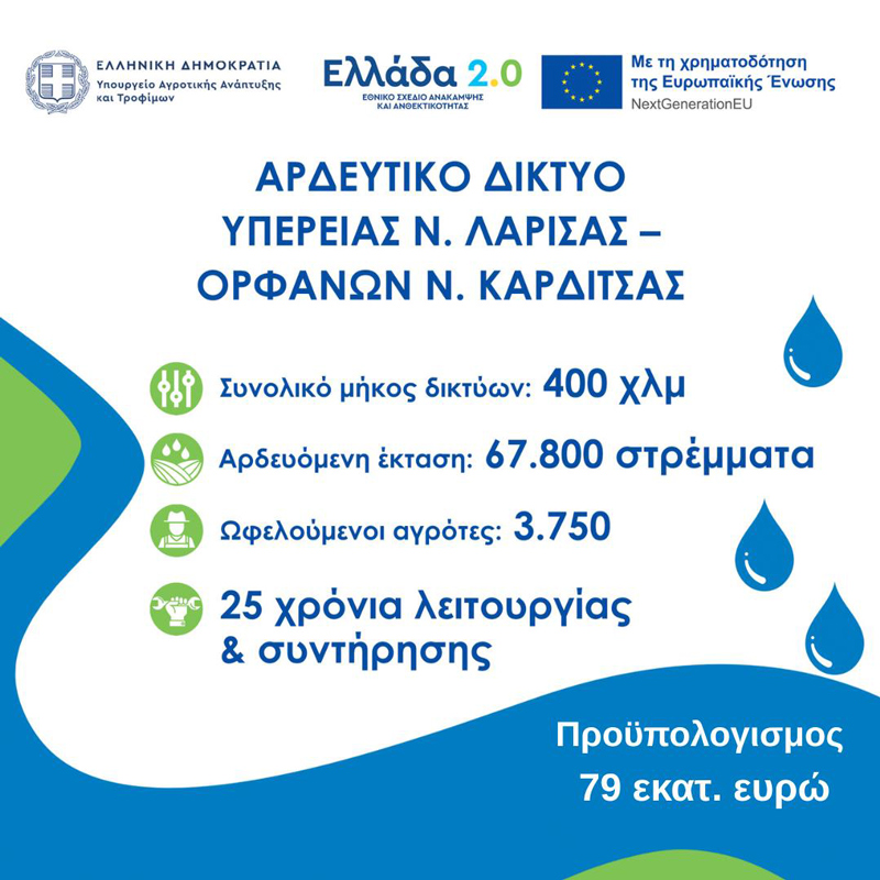 Στα Φάρσαλα, η υπογραφή της σύμβασης για το Αρδευτικό Δίκτυο Υπέρειας–Ορφανών πραγματοποιήθηκε στο Πολιτιστικό Κέντρο της πόλης. Το έργο αφορά την άρδευση 67.800 στρεμμάτων σε αγροκτήματα των Π.Ε. Λάρισας και Καρδίτσας και περιλαμβάνει 11 αυτόνομα αρδευτικά συστήματα που αξιοποιούν τις υφιστάμενες γεωτρήσεις, με πλήρη εξοπλισμό και δίκτυα μεταφοράς και διανομής. Το κόστος κατασκευής ανέρχεται σε 79 εκατ. ευρώ, ενώ ανάδοχος του έργου είναι η ένωση METLEN – Μεσόγειος Α.Ε.