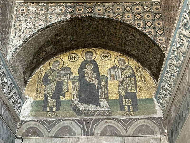Η Αγία Σοφία, χτισμένη τον 6ο αιώνα από τον Ιουστινιανό, υπήρξε για σχεδόν μία χιλιετία το σπουδαιότερο χριστιανικό μνημείο της Ορθοδοξίας. Η Θεοτόκος, εικονισμένη στον θρόνο με τον Χριστό στα γόνατά της, τοποθετήθηκε συμβολικά στον θόλο και την αψίδα, ως προστάτιδα του Βυζαντίου και πνευματική μητέρα της αυτοκρατορίας.