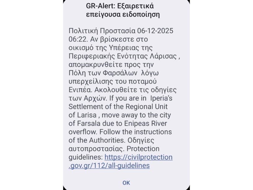 > «Αν βρίσκεστε στον οικισμό της Υπέρειας της Περιφερειακής Ενότητας Λάρισας, απομακρυνθείτε προς την πόλη των Φαρσάλων λόγω υπερχείλισης του ποταμού Ενιπέα. Ακολουθείτε τις οδηγίες των Αρχών.»
