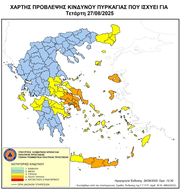 Η Περιφέρεια Θεσσαλίας ενημερώνει ότι σύμφωνα με τον Ημερήσιο Χάρτη Πρόβλεψης Κινδύνου Πυρκαγιάς της Γενικής Γραμματείας Πολιτικής Προστασίας, για την Τετάρτη 26 Αυγούστου 2025, προβλέπεται Κατηγορία Κινδύνου 3 (υψηλή) για περιοχές της Π.Ε. Μαγνησίας (περιοχή ευθύνης δασαρχείου Αλμυρού) και στις Σποράδες. Στο πλαίσιο αυτό, έχουν τεθεί σε αυξημένη ετοιμότητα όλες οι αρμόδιες υπηρεσίες και φορείς της Περιφέρειας, σε συνεργασία με το Πυροσβεστικό Σώμα, για την πρόληψη και άμεση αντιμετώπιση πιθανών πυρκαγιών.