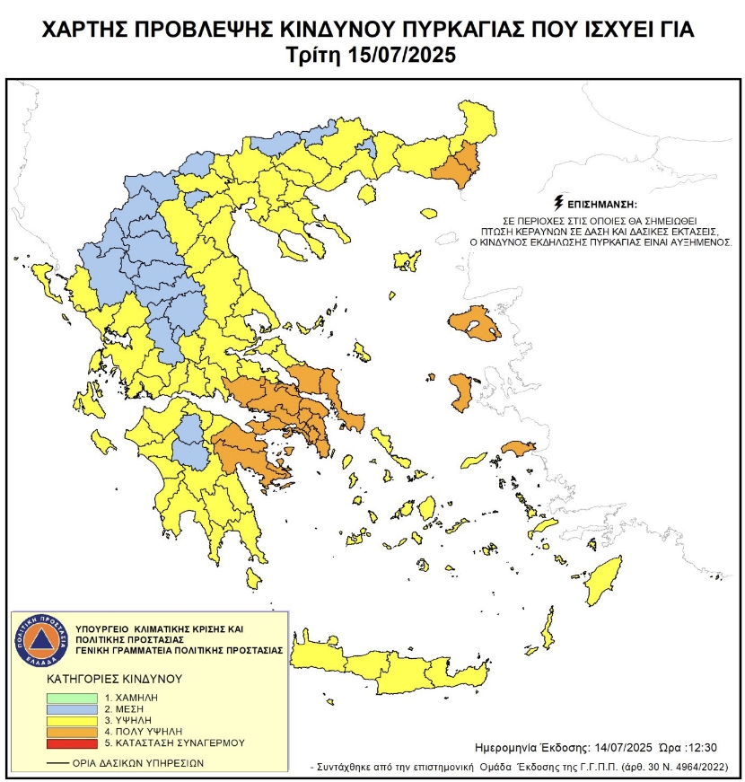 Η Περιφέρεια Θεσσαλίας ενημερώνει ότι σύμφωνα με τον Ημερήσιο Χάρτη Πρόβλεψης Κινδύνου Πυρκαγιάς της Γενικής Γραμματείας Πολιτικής Προστασίας, για την Τρίτη 15 Ιουλίου 2025, προβλέπεται Κατηγορία Κινδύνου 3 (υψηλή) για τις Π.Ε. Λάρισας και Μαγνησίας & Σποράδων.