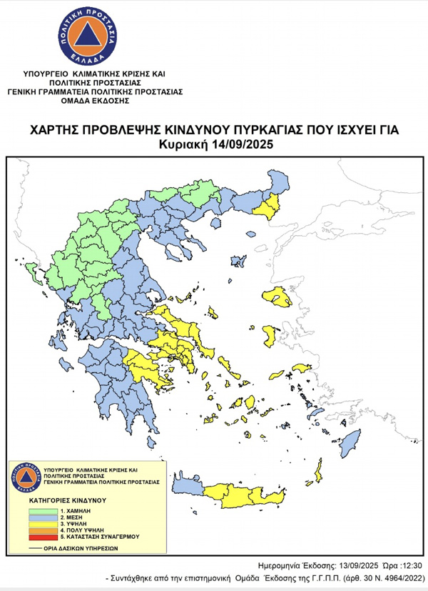 Η Περιφέρεια Θεσσαλίας ενημερώνει ότι σύμφωνα με τον Ημερήσιο Χάρτη Πρόβλεψης Κινδύνου Πυρκαγιάς της Γενικής Γραμματείας Πολιτικής Προστασίας, για την Κυριακή 14 Σεπτεμβρίου 2025, προβλέπεται Κατηγορία Κινδύνου 3 (υψηλή) για τις Σποράδες. Στο πλαίσιο αυτό, έχουν τεθεί σε αυξημένη ετοιμότητα όλες οι αρμόδιες υπηρεσίες και φορείς της Περιφέρειας, σε συνεργασία με το Πυροσβεστικό Σώμα, για την πρόληψη και άμεση αντιμετώπιση πιθανών πυρκαγιών.