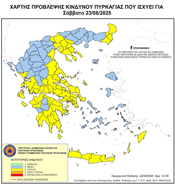 Όπως προβλέπεται με τον Ημερήσιο Χάρτη Πρόβλεψης Κινδύνου Πυρκαγιάς της Γενικής Γραμματείας Πολιτικής Προστασίας, για το Σάββατο 23 Αυγούστου 2025, προβλέπεται Κατηγορία Κινδύνου 3 (υψηλή) για τις Π.Ε. Μαγνησίας & Σποράδων και για περιοχές της Π.Ε. Λάρισας.