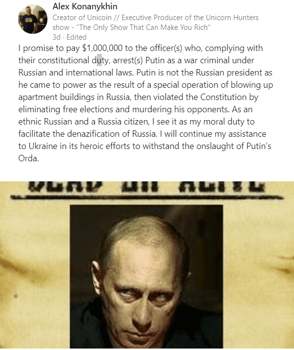 O επιχειρηματίας, συμπλήρωσε την ανάρτησή του αναφέροντας ότι «ως Ρώσος και Ρώσος πολίτης, θεωρώ ηθικό μου καθήκον να διευκολύνω την αποναζιστικοποίηση της Ρωσίας. Θα συνεχίσω τη βοήθειά μου στην Ουκρανία στις ηρωικές προσπάθειές της να αντέξει την επίθεση της Ορντά του Πούτιν». Η ανάρτηση συνοδευόταν από μια εικόνα με μια φωτογραφία του Πούτιν, λέγοντας: «Ζητείται: Νεκρός ή ζωντανός. Βλαντιμίρ Πούτιν για μαζική δολοφονία».