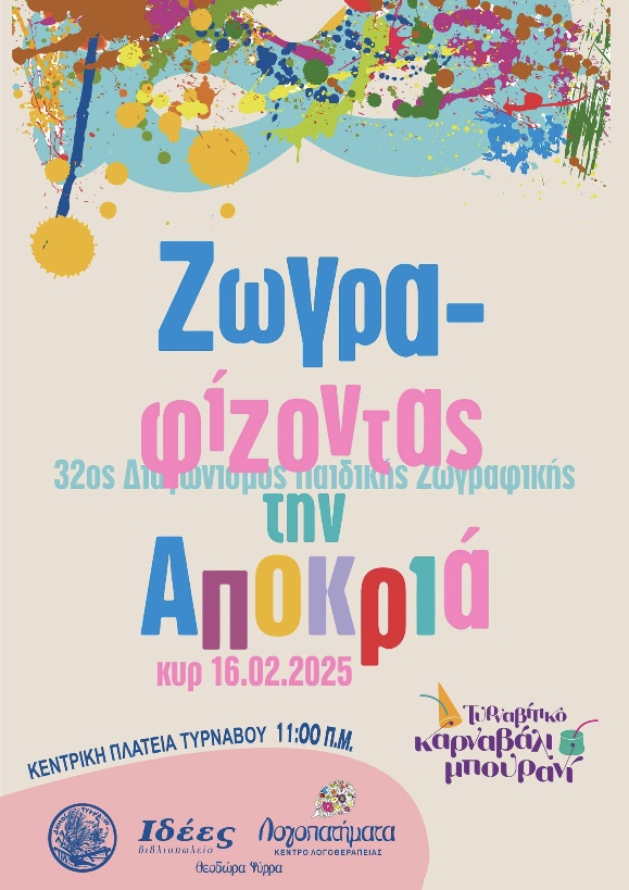 Το πρωί της Κυριακής 16 Φεβρουαρίου 2025 θα πραγματοποιηθεί ο 32ος Διαγωνισμός παιδικής Ζωγραφικής «Ζωγραφίζοντας την Αποκριά» στην Κεντρική Πλατεία Τυρνάβου από το Βιβλιοπωλείο «Ιδέες» και το Κέντρο Λογοθεραπείας «Λογοπατήματα» της κ. Θεοδώρας Ψύρρα σε συνεργασία με τον Δήμο Τυρνάβου.