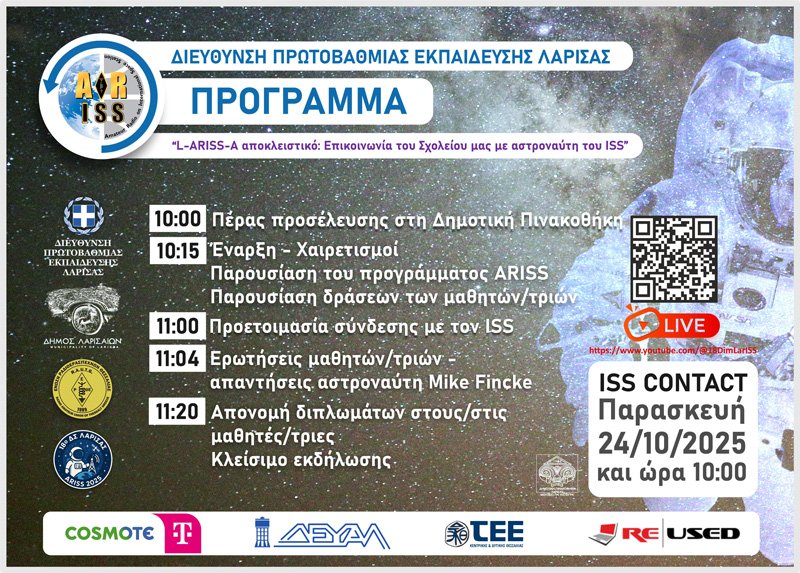 Η ανωτέρω μοναδική για τους μαθητές και μαθήτριες εμπειρία, με τίτλο: “L-ARISS-A αποκλειστικό: Επικοινωνία του σχολείου μας με αστροναύτη του ISS”, συνδιοργανώνεται από τη Διεύθυνση Πρωτοβάθμιας Εκπαίδευσης Λάρισας, τον Δήμο Λαρισαίων, την Ένωση Ραδιοερασιτεχνών Θεσσαλίας και το 18ο Δημοτικό Σχολείο Λάρισας, στο πλαίσιο του διεθνούς προγράμματος ARISS και θα πραγματοποιηθεί στις 24 Οκτωβρίου 2025, και ώρα 10 π.μ., στη Δημοτική Πινακοθήκη Λάρισας – Μουσείο Γ. Ι. Κατσίγρα.